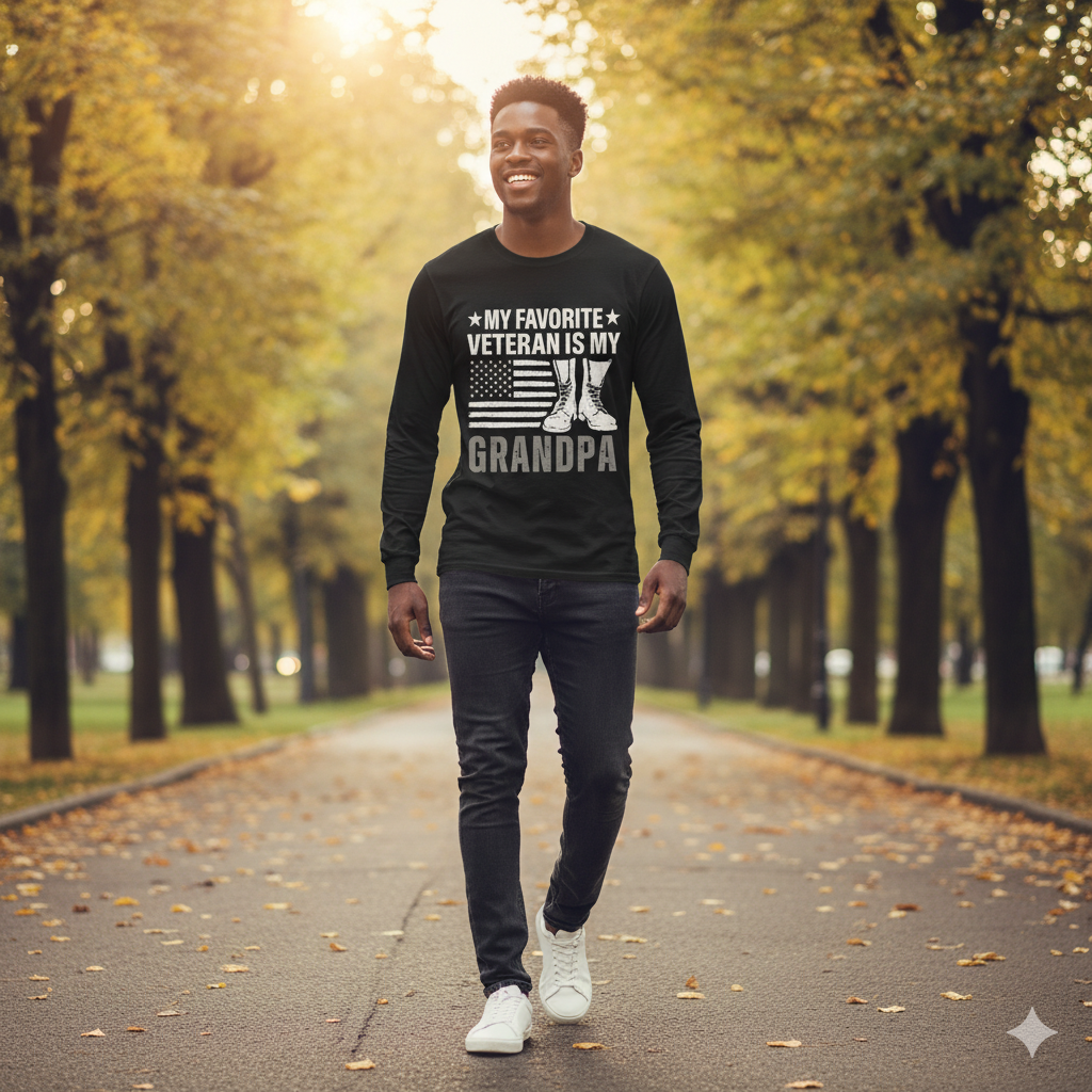 There’s pride in every thread of this “My Favorite Veteran Is My Grandpa” long sleeve — a heartfelt way to honor your hero while staying warm in classic comfort. Made from a soft cotton blend and available in four timeless colors, it’s perfect for Veterans Day, family photos, or just showing everyday gratitude.