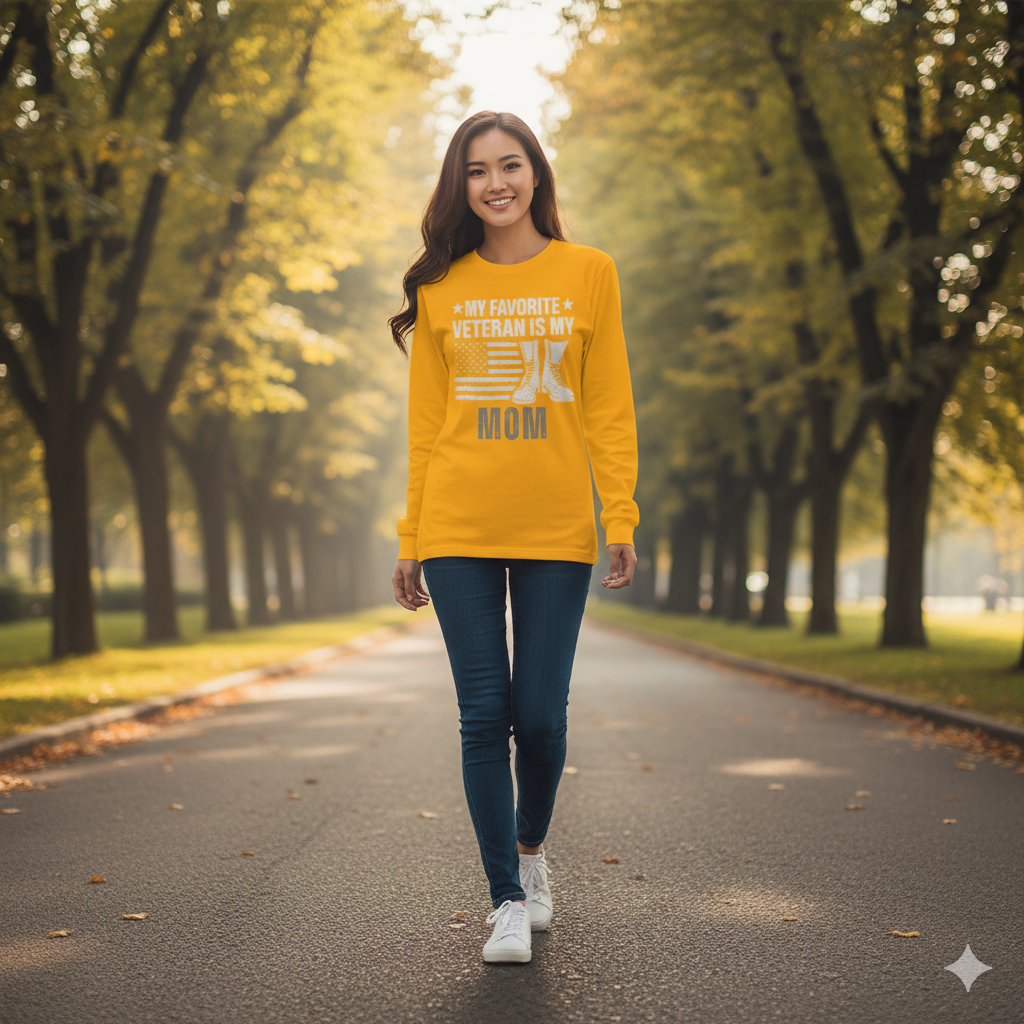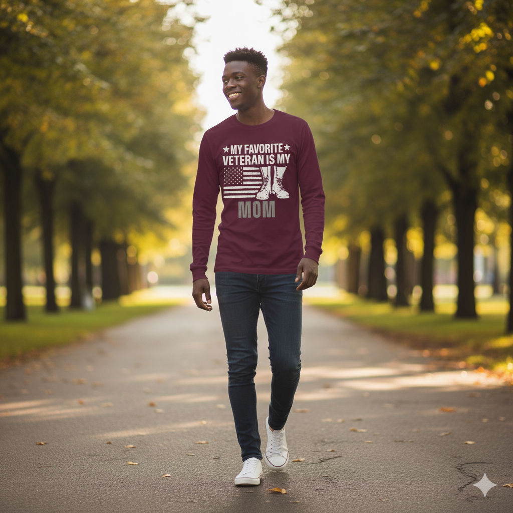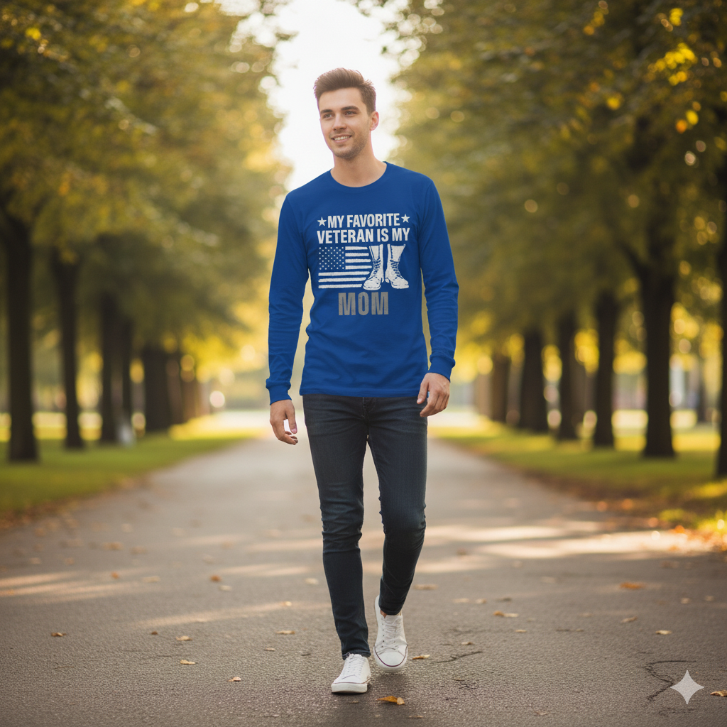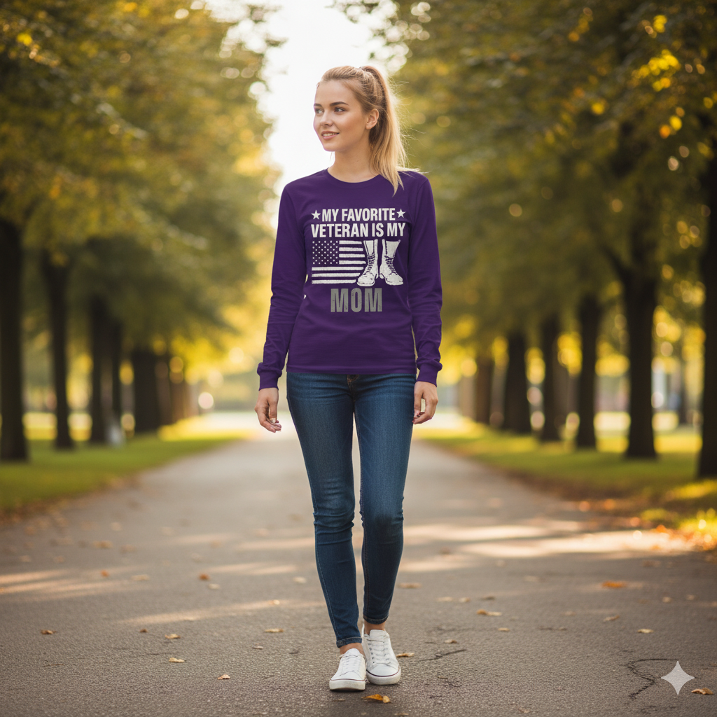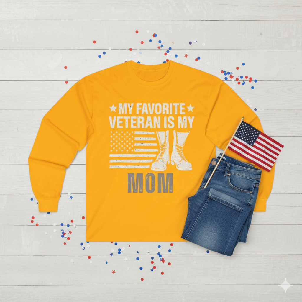 Step out with pride and gratitude in this heartfelt “My Favorite Veteran Is My Mom” sweatshirt. Perfect for Veteran’s Day, family gatherings, or everyday wear — it’s more than fabric, it’s a tribute.